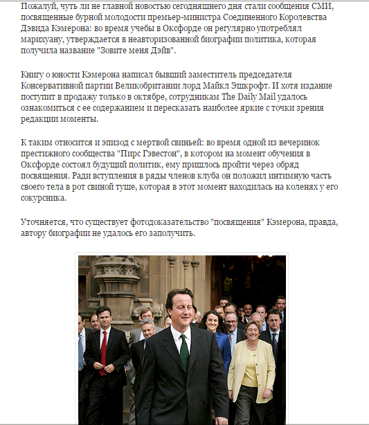 Правда это или нет, но интернет на сегодня решил, что британский премьер-министр Дэвид Кэмерон в свою бытность студентом Оксфорда вложил интимную часть своего тела в рот свиной туше. С такими утверждениями выступили представители истэблишмента с обширными связями — бывший заместитель председателя Консервативной партии лорд Майкл Эшкрофт (Michael Ashcroft) и бывший редактор политического раздела Sunday Times Изабель Оукшотт (Isabel Oakeshott). Эта история была опубликована в Daily Mail, благодаря чему данная газета вошла в высшую лигу очернителей репутации и уничтожителей личности в британской политике.