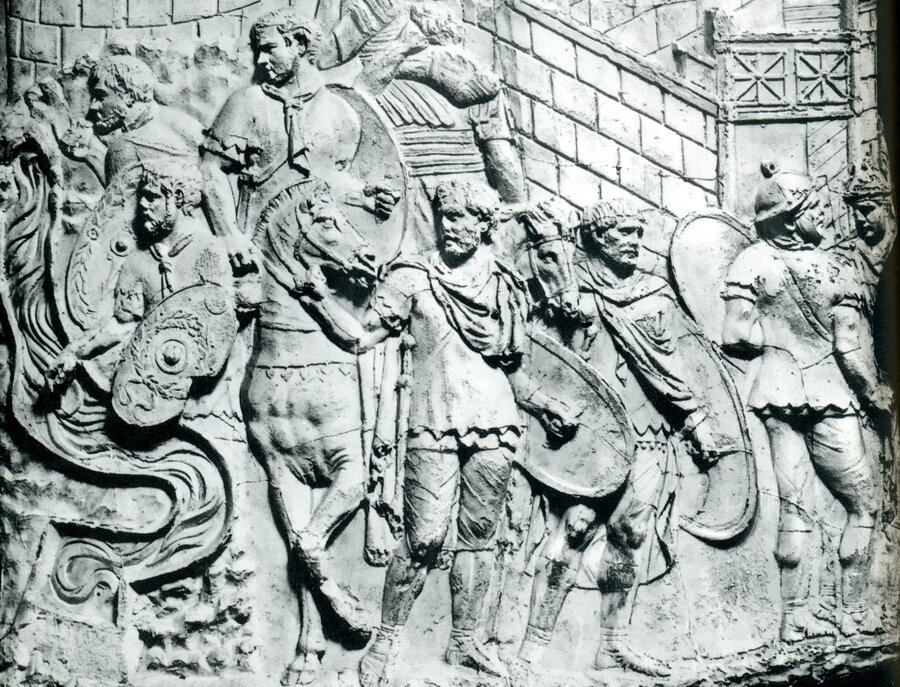 Такое легко проверить, изучив под мелкоскопом знаменитую Колонну Траяна в Риме (возведена в 101-106 гг. н. э.), где римские солдаты приветствуют своего любимого императора поднятием открытой рукой, не вытягивая её. А покорённые варвары изображены на фризах с опущенными вниз руками, что всегда являлось в эллинистическом искусстве символом покорности. Сам император тоже слегка приподнимает руку, держит её чуть согнутой, поставив ладонь вертикально и чуть раздвинув пальцы. В римской литературе есть десятки упоминаний о поднятии (резким движением) руки подвысь... так было положено брать слово оратору или сенатору на публичном выступлении.