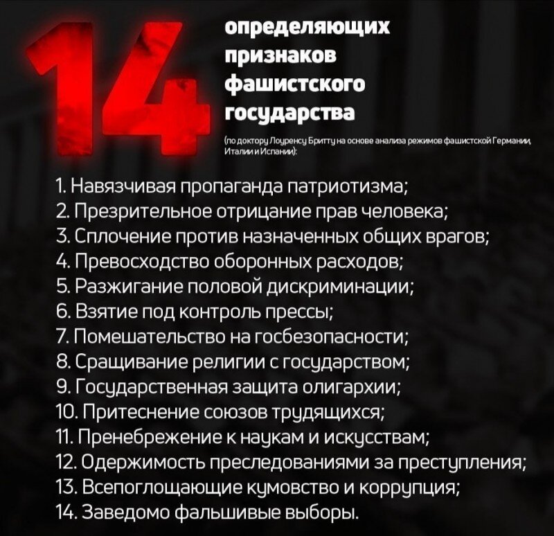 Теперь к хорошо кое-кем выученным урокам. Что такое фашизм? Определений много, признаков — ещё больше придумано. С вашего позволения, не буду комментировать концепцию британского журналиста Лоуренса Бритта, который на примере исторических примеров существования семи «фашистских режимов» сформулировал знаменитые «14 признаков». Вот они...