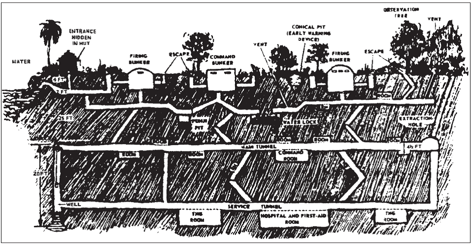 Они были способны провести за собой в нужный сектор обороны подразделения любой численности, один резервный батальон скапливался на «боевом уровне» за полтора суток, мог действовать до полутора недель на имевшихся там запасах пищи и БК. Главными «воротами» во внешний мир были «бобровые хатки», специальные тоннели, выходящие (через воздушные сифонные колени лаза) прямиком под берега реки Сайгон.