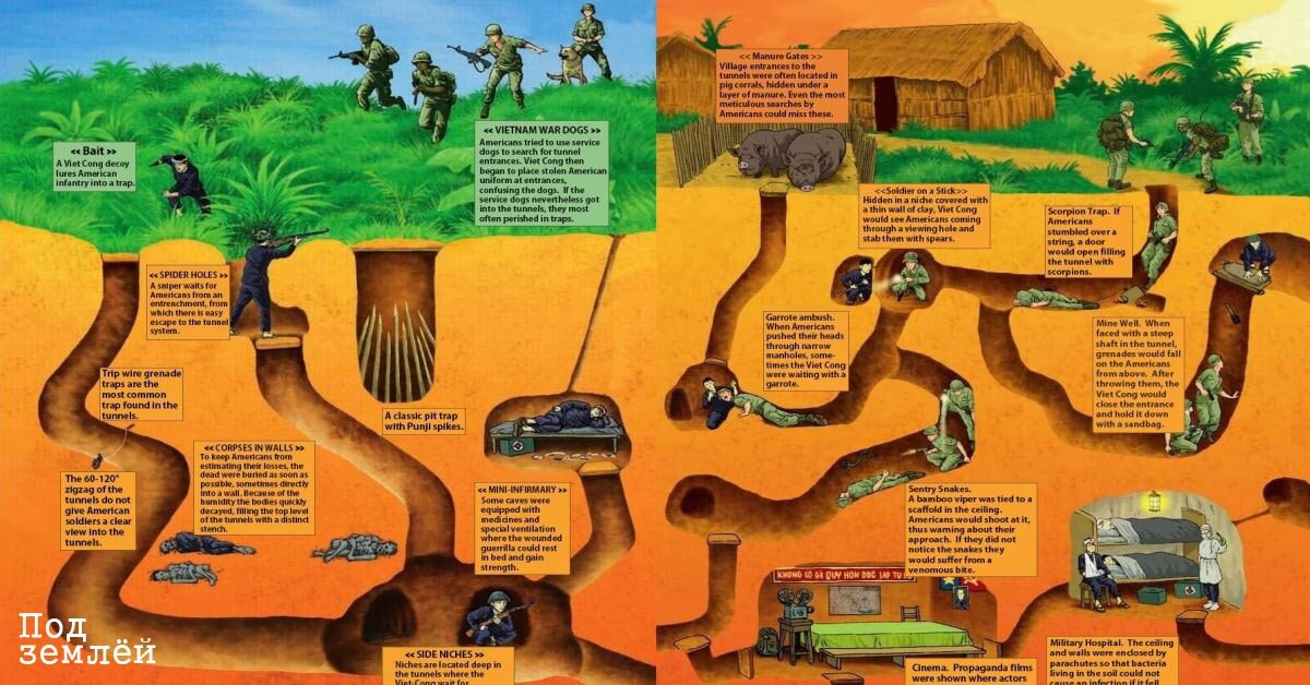 И да... несколько тоннелей вели в сторону Камбоджи, именно оттуда приходили по ротации батальоны Вьетконга, доставлялись боеприпасы и оружие. Пришедшие с кадровыми частями инженеры помогли страшную жизнь подземелий сделать относительно сносной. Прямо перед появлением американцев Ку Чи был оборудован полноценной вентиляционной системой, воздуховоды из сотен бамбуковых труб выходили прямо в муравейники на поверхности (на инфракрасных приборах янки жилища насекомых всегда светились из-за высокой внутренней температуры).