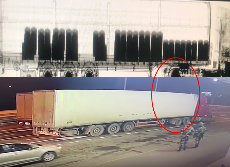 Груз просвечивали на каком-то таможенном посту, это заметно по компоновке колес фуры, скорее всего на российско-грузинской границе. Из обнародованного ФСБ снимка видно: везут обычный груз, соответствующий накладной. Камуфляж идеальный сделан, наверняка не раз проверенный как опытными пограничниками и таможенниками (визуально), так и техническими средствами.