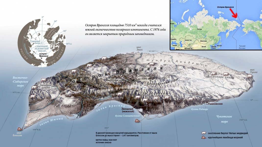 Итак. Остров Врангеля расположен в Северном Ледовитом океане между Восточно-Сибирским и Чукотским морями, назван в честь мореплавателя и государственного деятеля XIX века Фердинанда Петровича Врангеля. О существовании некой суши в тех водах русские сорвиголовы-казаки знали ещё в XVII веке, с их слов он был нанесён на карту первопроходцем Иваном Львовым, аккуратно перенесён на карты академика Ломоносова под названием «Сомнительный». В 1764-м году в подзорную трубу (якобы) его наблюдал картограф Степан Андреев, но экспедиция барона Фердинанда Врангеля так и не пробилась к неизвестной земле.