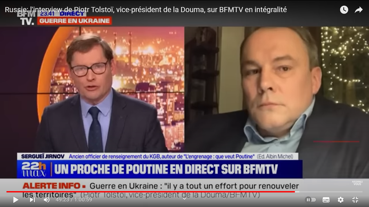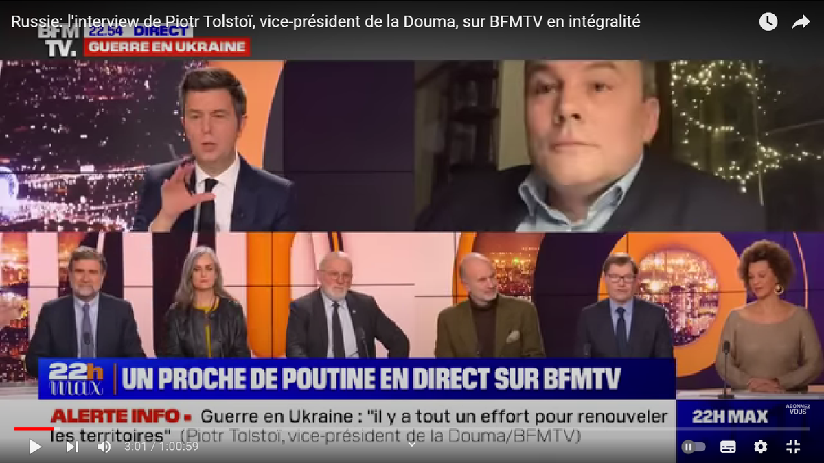Ответ П. Толстого: "Да, мы живем на разных планетах, потому что посредством американского нарратива, посредством вашей лжи, которую вы распространяете во Франции и в Африке, вы извратили, исказили видение мира, в котором вы живете. Вы в Европе верите, что Запад это центр мира, в то время, как 75 % иностранных предприятий остались и работают в России, и большая часть мира продолжает работать с Россией, и наши связи с остальным миром развиваются сейчас гораздо быстрее, чем во времена нашего сотрудничества с Европой. Настоящее видение мира от вас сокрыто". (Звучит гонг. Конец передачи)