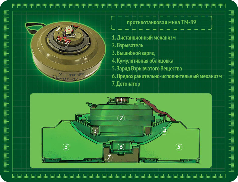 Взрыватель там двойного действия, магнитного и нажимного. В первом варианте его запускает возмущение поля от прохождения большой массы металла, вышибной заряд отбрасывает грунт, кумулятивная струя испепеляет сам танк/бронемашину вместе с экипажем. Если же на ТМ-89 наехать гусеницей — она срабатывает как обычный фугас, просто обездвиживая боевую машину и нанося ходовой сильные повреждения. Мину не очень любят суеверные сапёры, у неё сложный механизм установки, а магнитный взрыватель после взвода намекает: находиться поблизости в бронежилете и с оружием… чревато.