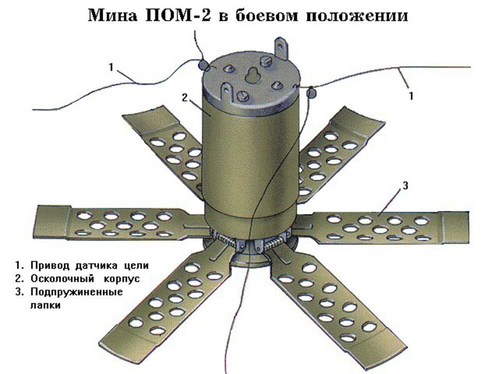 В старой модификации дистанционное минирование выглядело так: вылетая из реактивной кассеты-снаряда, эти поганцы-неваляшки на земле выпускали опорные «лепестки», сбрасывали защитный кожух и раскидывали сверхтонкие нити с грузилами в разные стороны. Стоило задеть одну из «паутинок», ПОМ-2 подлетала ввысь и взрывалась, выкашивая осколками всё живое на десятки метров.