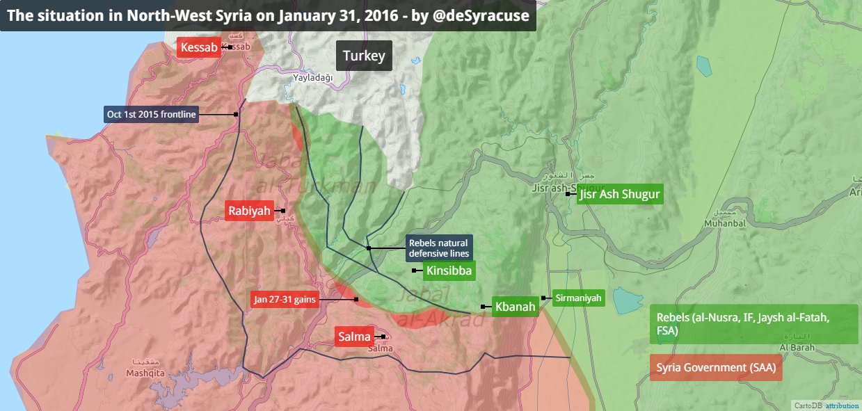 Сирийская армия при поддержке ВКС РФ теснит террористов группировки Джебхат Ан-Нусра в горных районах провинции Латакия. Взята ключевая высота около города Сальма, последнего форпоста боевиков в этом регионе, город взят в огневое окружение и готовится штурм.