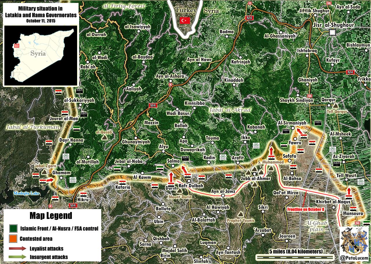 Несмотря на ожесточённое сопротивление боевиков различных иссламистских группировок, силы Сирийской арабской армии при поддержке российских ВКС в течение 9-11 октября продолжили наступление на ряде участков северного фронта. Подразделения САА прорвали фронт противника в долине аль-Габ, продвинувшись на несколько километров к северу от недавно освобождённой Бахсы. Начато наступление в сложной местности в горах на подступах к г.Сальма.