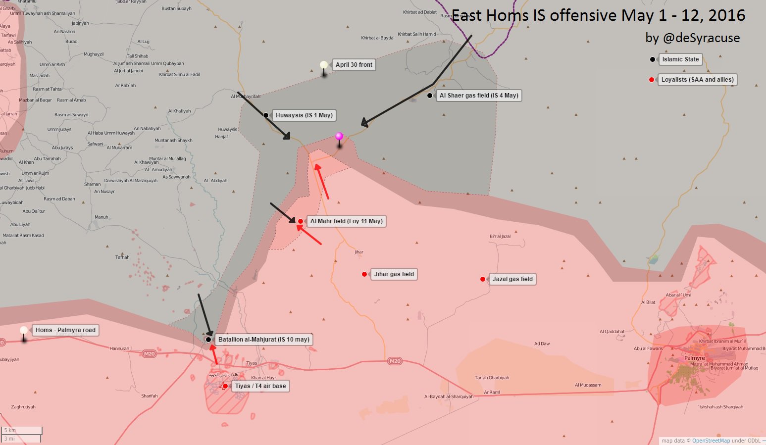 Общая схема майского контрнаступления Халифата к северу от Пальмиры. К 14-15 мая оно было полностью остановлено, противник понеся существенные потери (в том числе и ввиду действий российского контингента) прекратил активные наступательные действия. Примерно к этому времени относятся противоречивые сообщения про взрыв на аэродроме Тияс, которые так и не получили фото и видео подтверждений.
