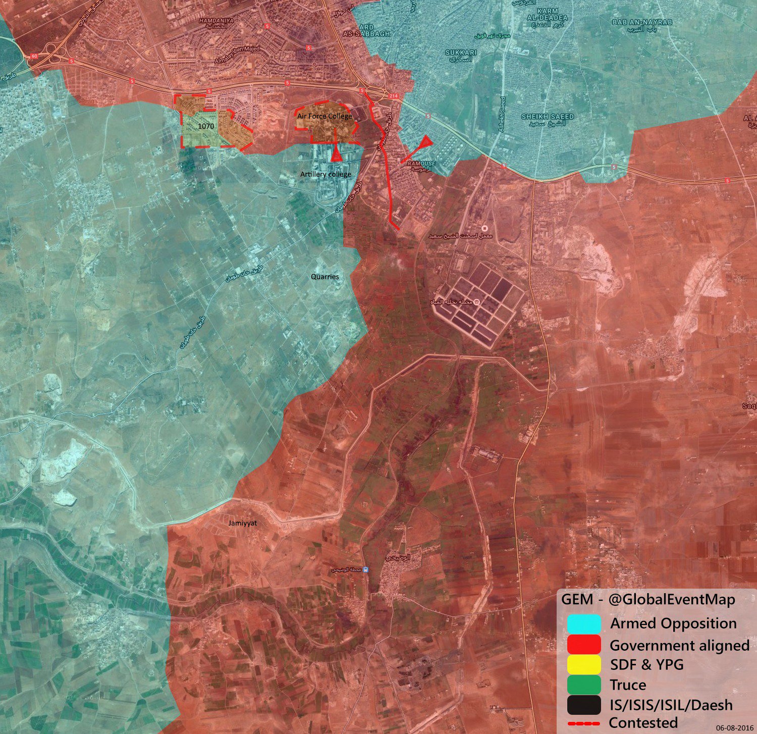 На 2 часа дня, атаки боевиков "Ан-Нусры" и "Ахрар-аш-Шам" на технический колледж и квартал Рамусех были отбиты. На данный момент линия фронта пролегает по территории артиллерийской академии. Очевидно, что для продолжения наступления боевикам надо обязательно брать технический колледж, так как что в ближайшее время они очевидно проведут перегруппировку и пойдут на штурм. Ориентировочно после 15 часов, в бой должны вступить подразделения прибывшие в квартал Рамусех.
