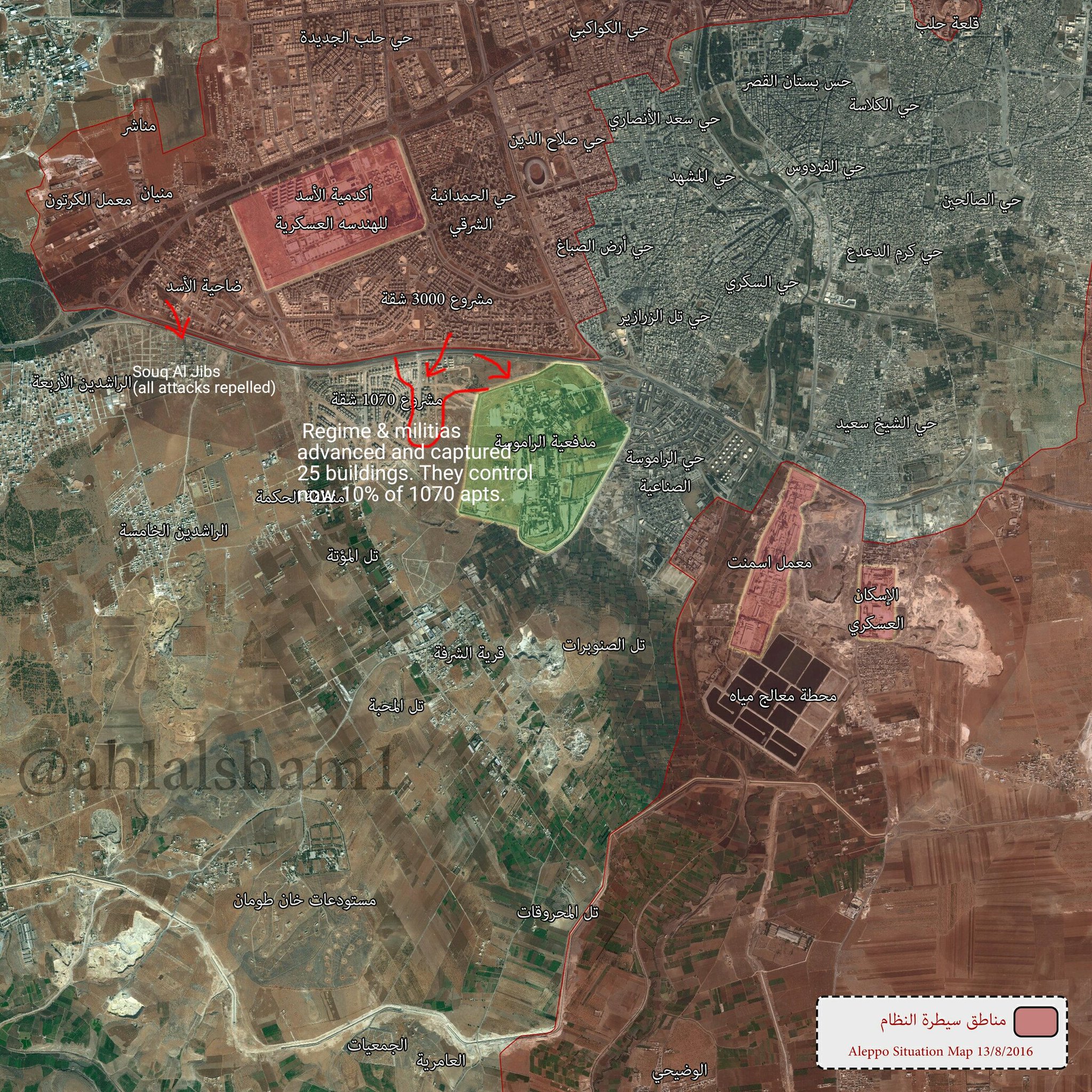 В районе Захра, ситуация полностью стабилизировалась и армия контролирует все ключевые позиции, отразив наступление боевиков "Ахрар-аш-Шам", усилий которых хватило лишь на то, чтобы с потерями пробиться в северо-западную часть квартала, откуда они в ходе боев 15-16 августа были выбиты, потеряв несколько десятков человек. Очевидно, что атака предпринималась недостаточными силами, но боевикам крайне важно сейчас напрягать западный фланг группировки Асада в западном Алеппо, чтобы сирийцы не могли безболезненно кидать все силы на юг в бои за 1070, школу Хикма и район развязки у Рамусеха. Но на мой взгляд боевики поспешили, им надо было продолжать накапливать силы для более серьезного удара в районе Ларамуна, чтобы попробовать вызвать кризис в районе трассы у Кастелло и ферм Маллах, чтобы заставить САА бросить сюда часть сил, необходимых для боев за коридор.