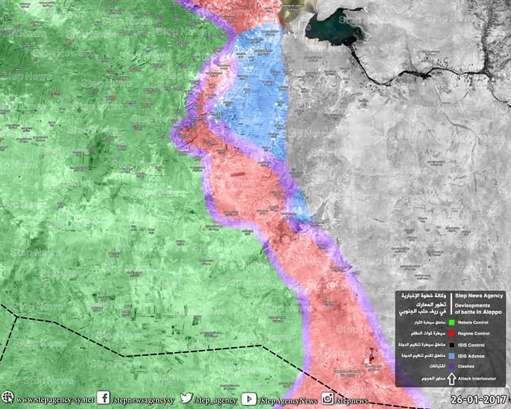 26 января подведя к фронту со стороны Табки подкрепления, "черные" нанесли контрудар в направлении трассы Ханассер-Алеппо и на ряде участков смогли к ней приблизится. При этом отряды "Лива-Фатимиюн" (афганские шииты) понесли достаточно существенные потери. Эта ситуация далеко не нова. Аналогичные набеги на эту дорогу предпринимались неоднократно. Наиболее громкие набеги произошли осенью 2015 и в феврале 2016 года, когда трасса даже на несколько дней была перерезана, что давало повод особо впечатлительным барышням заявлять, что "скоро войска Асада в Алеппо будут окружены" и "военная катастрофа режима неизбежна".