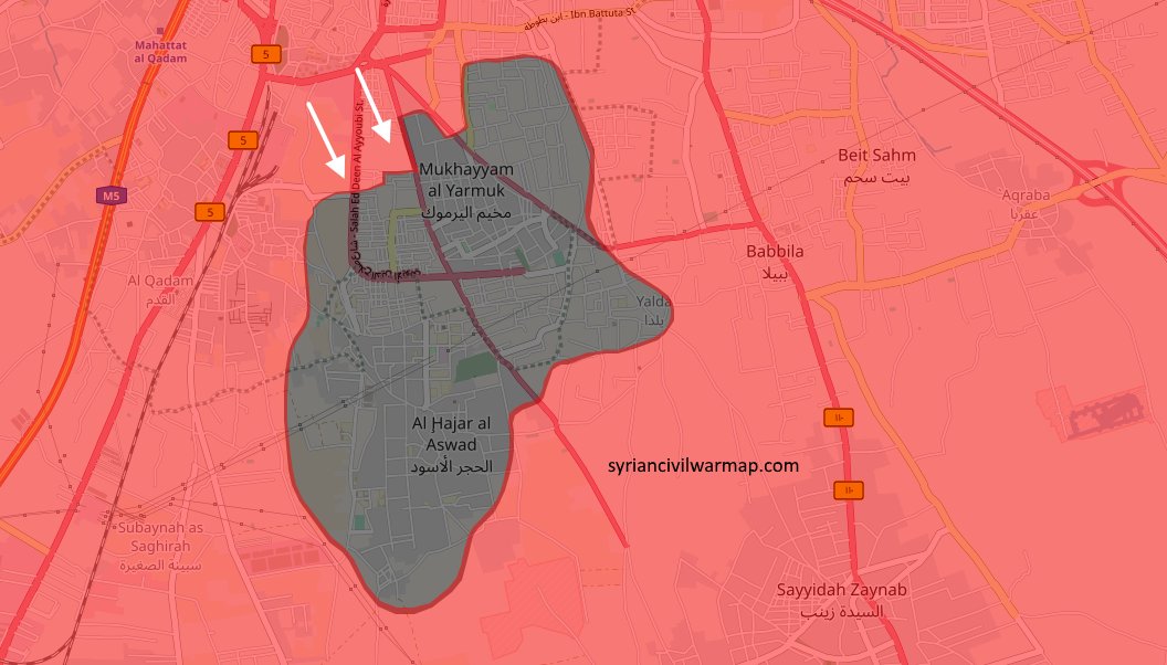 42-я механизированная бригада, которую еще называют «танковый спецназ» и палестинские формирования «Ливаа аль-Кудс» атаковали на юго-востоке в районе Хаджар аль-Асвад, в то время, как подразделения 105-й бригады Республиканской гвардии и отряды Фронта освобождения Палестины штурмуют позиции «Исламского государства» в районе Аль-Кадам.