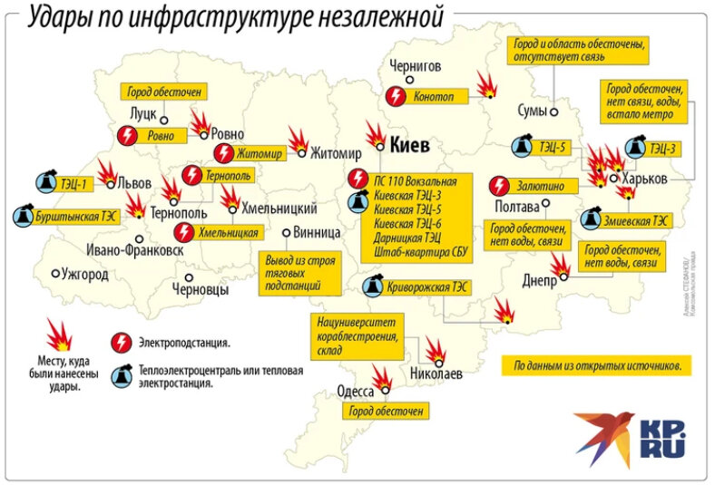 Характер повреждений приглашает ремонтные бригады очень быстро восстановить некоторые энергетические объекты, к другим — категорически не приближаться. Хотя несколько десятков метров влево-право… и ущерб мог стать неприемлемым кое-где. Но ракеты попали повсеместно куда нужно: стратегические объекты (большей частью) сохранили работоспособность, основной урон пришёлся на региональные подстанции и отдельные города. Именно там сидели с лучинами и фонариками.