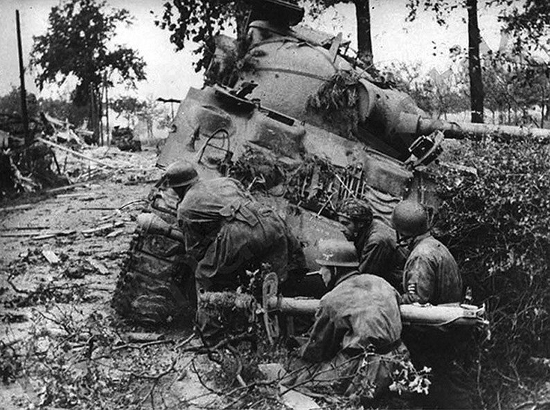 «Битва в бокажах», даже после восстановления господства в воздухе, для союзников уменьшением потерь не обернулась. Что под Каном, что в Сен-Ло немцы прекрасно маскировались, превращали каждого солдата, орудие, танк, бронемашину и позицию… в часть природного пейзажа, имели такие же запасные. В бокажах прорывали подземные тоннели, делали замаскированные проходы для техники, устраивали в переплетении корней блиндажи и ДОТы, связывали траншеями участки обороны. А любой просвет в изгородях становился амбразурой. Хоть для «циркулярной пилы Гитлера» (пулемёт МГ-42), хоть для танка.