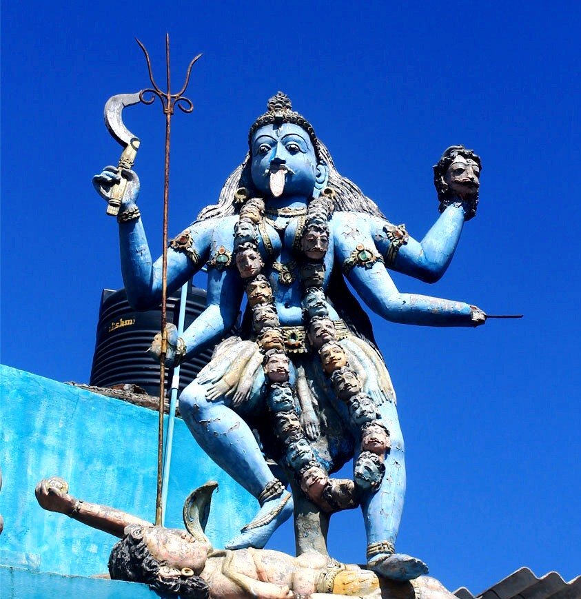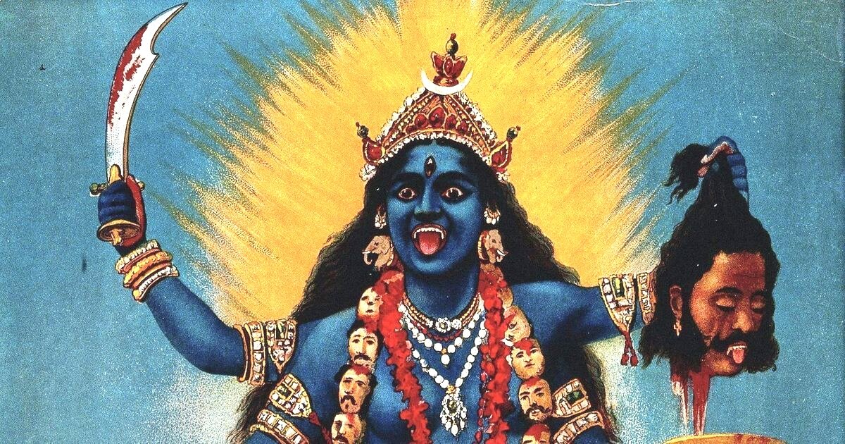 Именно в таких узнаваемых цветах с окровавленным мечом и «щитом» виде отрубленной головы всем образованным людям известна индуистская богиня Кали, символ свирепости, смерти и разрушения, убийца демонов. Божество с испорченной напрочь репутацией благодаря пропаганде о секте её поклонников-душителей под названием «тхаги» (туги, тхуги, пхасингары). Использованных британцами для разжигания межрелигиозной резни и покорения Индии.