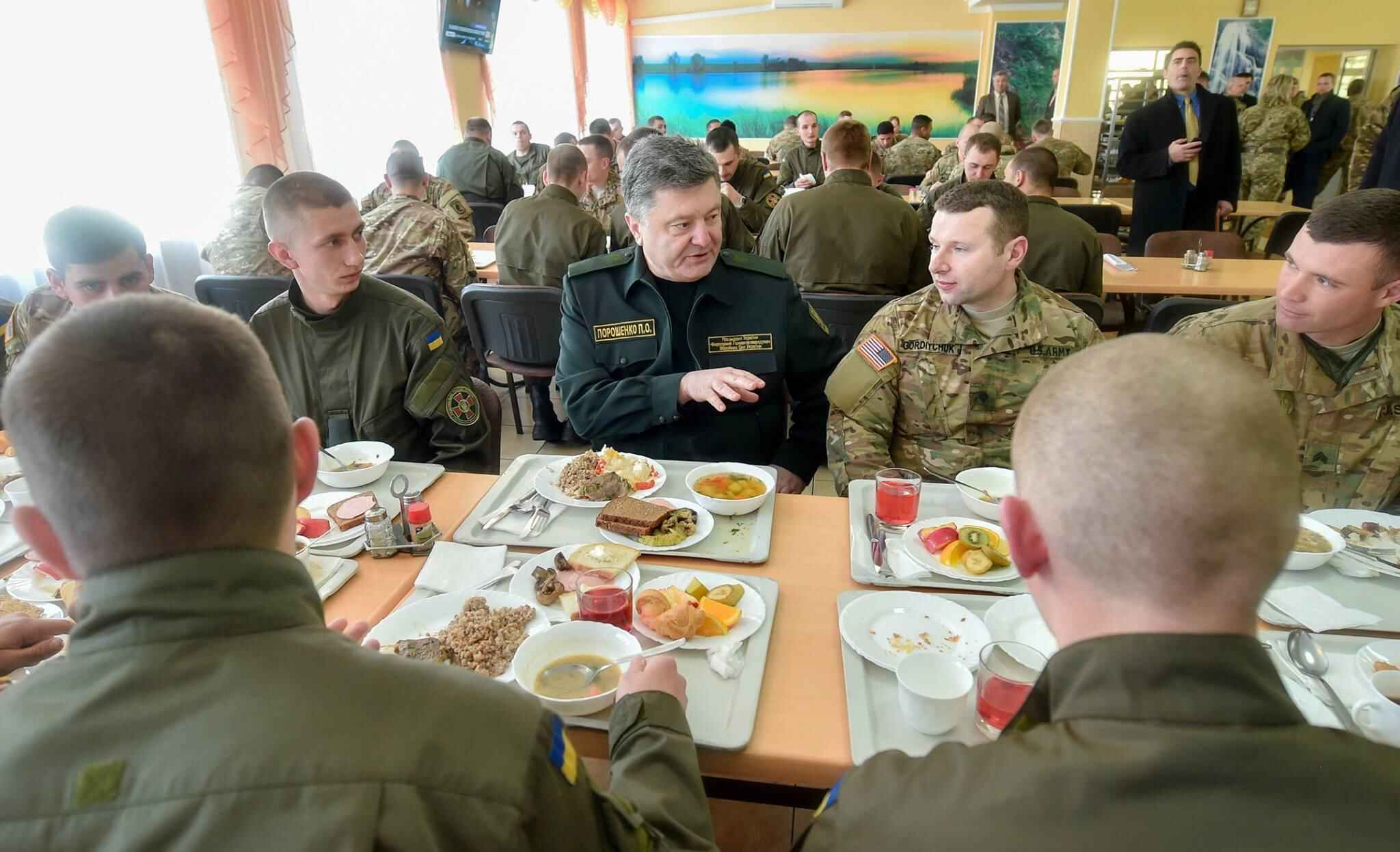 Порошенко в присутствии американского посла сначала вновь озвучил тезис о том, что на Донбассе «решается судьба Европы», объявил о новом уровне сотрудничества с США, а затем сделал несколько показных снимков в солдатской столовой.